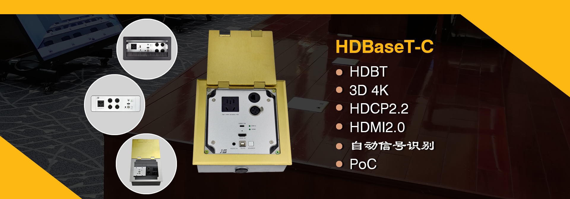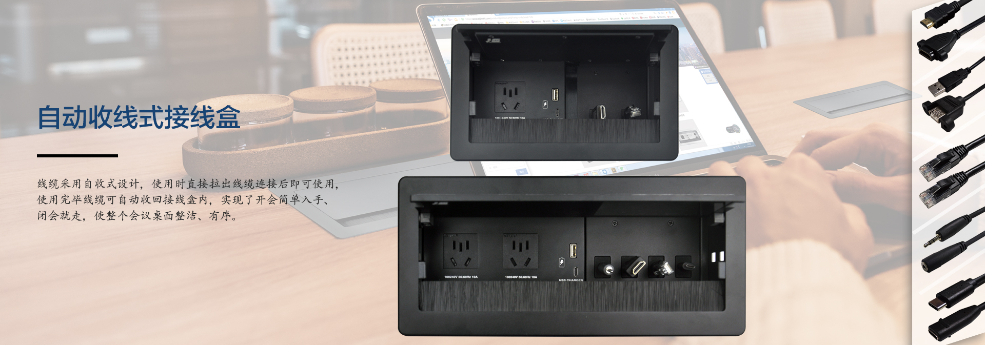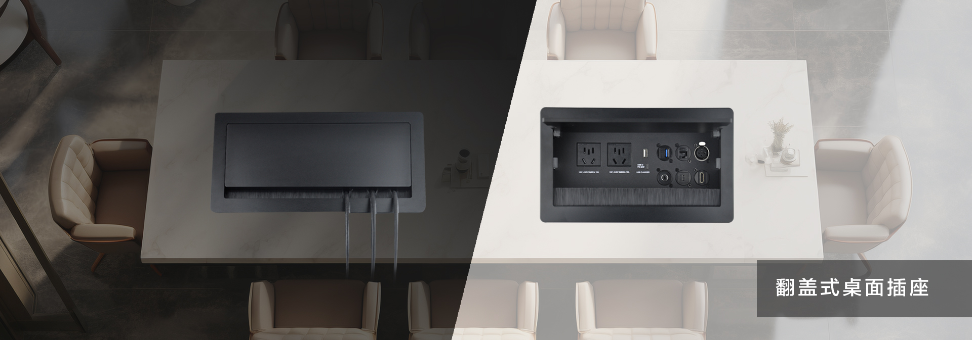 ? 某公司視頻會議項目,在設備選型中,金視JS-MF定制桌面插座)成為項目選定品牌及型號,視頻會議共使用43套金視產品;(其中21臺為銀色,19臺黑色 分1層和5層會議室使用)? 金視JS-MF定制產品?桌面電動翻轉插座,可藏式接線盒提供了一個整潔、緊湊、簡單的連接解決方案。采用電動控制,使用時只需輕按接線盒開啟按鍵,接線盒 180°旋轉,隱藏的各種接口即展現