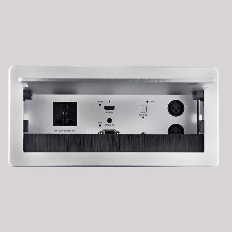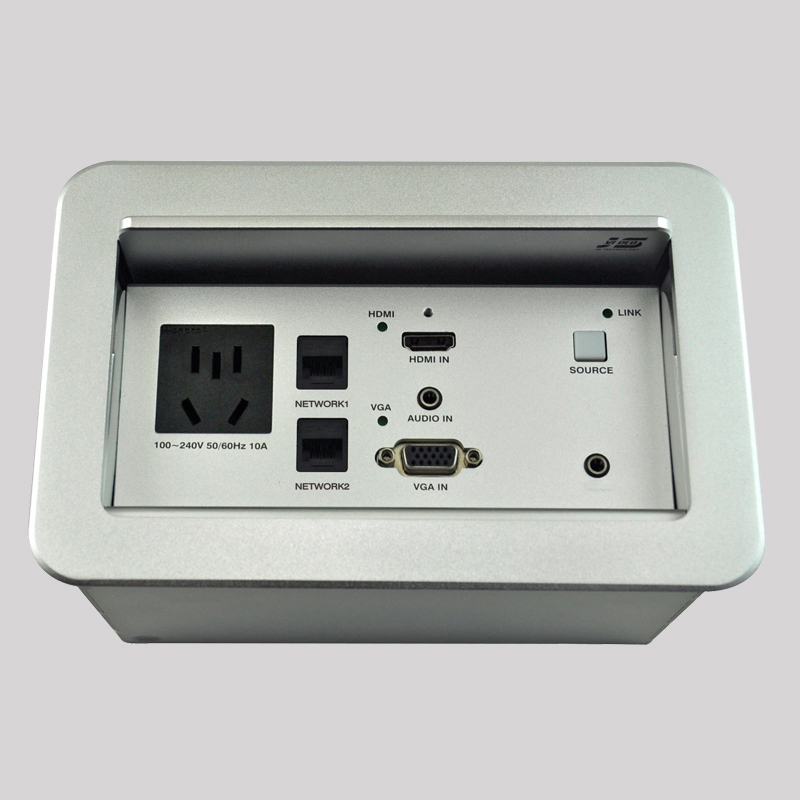 JS-U101HD可藏式接線盒是一款帶高清轉換的適合桌面下吊裝式接線盒,采用高性能專業轉換芯片,將VGA+AUDIO、HDMI、信號轉換成高清格式的HDMI信號輸出,VGA支持分辨率640*480 至1920*1080P或1920*1200,用戶可以通過面板上的按鍵來選擇切換信號.JS-U101HD可藏式接線盒提供了一個整潔、緊湊、簡單的連接解決方案。被設計成能夠安裝在桌臺下面、側部,可以保持臺面